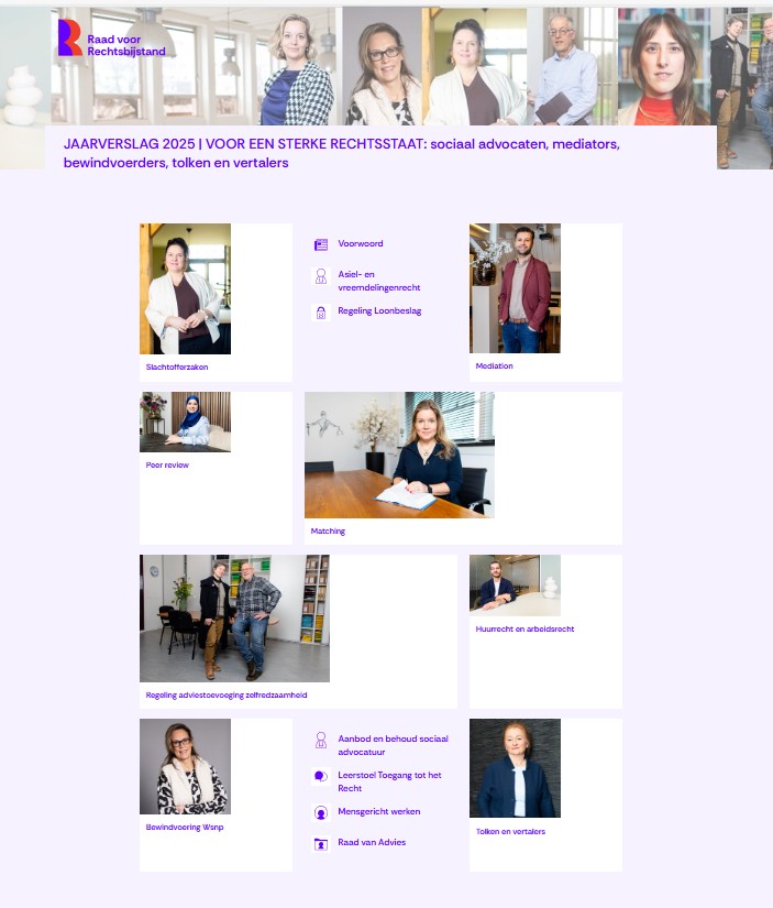 De verhalen illustreren de werkelijkheid achter de cijfers over rechtsbijstand, mediation, de wettelijke schuldsanering, tolken en vertalers. In het jaarverslag presenteren we daarnaast de cijfers voor 2025, een kwantitatieve weergave van de uitvoering van de RvR, en de kerncijfers. Verder geven we een inkijkje in de ontwikkelingen binnen de RvR, zoals het mensgericht werken en matching als extra service van de RvR.